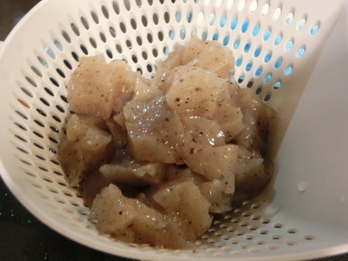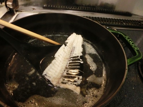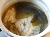 鍋に移し、水を張って、中火にかけます。 沸騰寸前で火を弱くし、時間をかけて旨みを引き出します。 途中でアクをこまめに取り除くように。 霜降りもアク取りも、臭みを出さず旨みを引き出す為です。 こうすると「せっかくの魚のうま味が消える」と思うでしょうが、それはうま味ではなく「臭み」であって、特別な魚好き以外の人は食べられません。 霜降り
